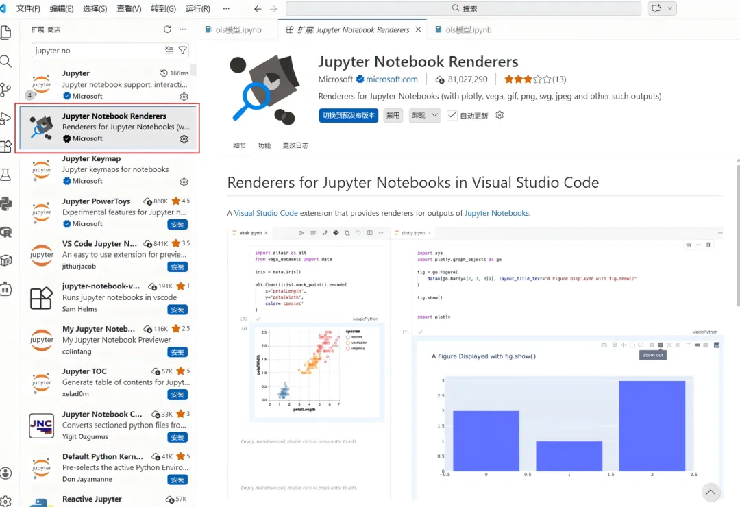 Jupyter Notebook Renderers 插件。安装完重启编码器,再次运行代码就出来啦!