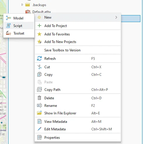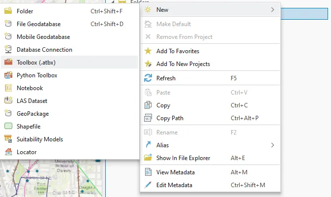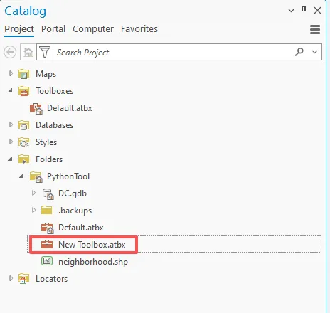 在 ArcGIS Pro 的目录窗格中,右键单击 PythonTool 文件夹,然后依次单击新建和工具箱 (.atbx)。