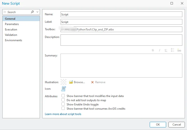 在新建脚本窗口中,将名称项修改为ClipandZIP,工具名称是工具使用的内部唯一标识名称。名称只能包含字母和数字。 空格和特殊字符不允许使用。