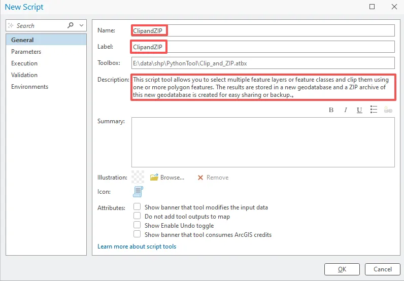 在描述框中,输入 This script tool allows you to select multiple feature layers or feature classes and clip them using one or more polygon features. The results are stored in a new geodatabase and a ZIP archive of this new geodatabase is created for easy sharing or backup.。