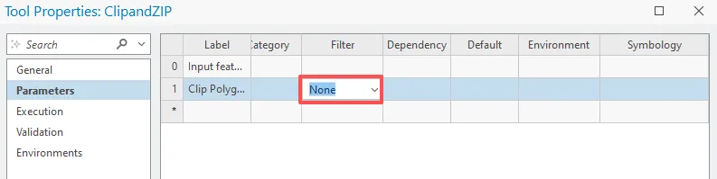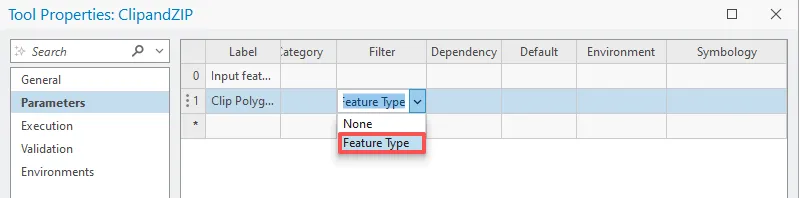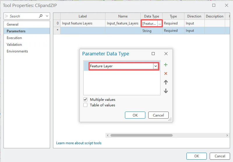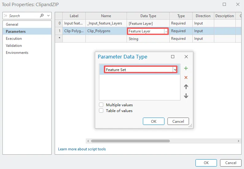 在参数选项卡上表格第二行中,单击标注列,输入 Clip Polygons,然后按 Enter 键。其中数据类型选择要素集。