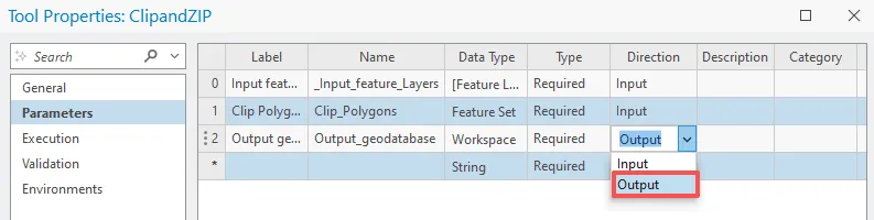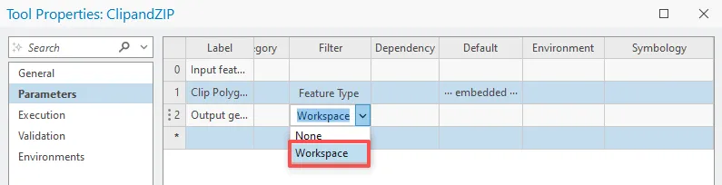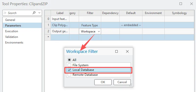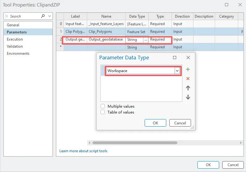 在参数选项卡上表格第三行中,单击标注列,输入 Output geodatabase,在数据类型列中,单击更改数据类型按钮。对于数据类型,单击下拉列表,然后依次单击工作空间和确定。