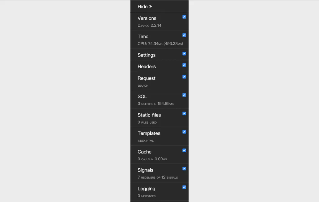 - 4. 在配置好Django-Debug-Toolbar之后,页面右侧会看到一个调试工具栏,如下图所示,上面包括了如前所述的各种调试信息,包括执行时间、项目设置、请求头、SQL、静态资源、模板、缓存、信号等,查看起来非常的方便。