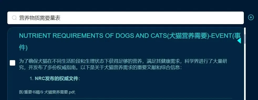 注:这个图表示在搜索【营养物质需要表】时,搜索出的详情为【为了确保犬猫在不同生活。。。】,之后,再看一张截图如下: