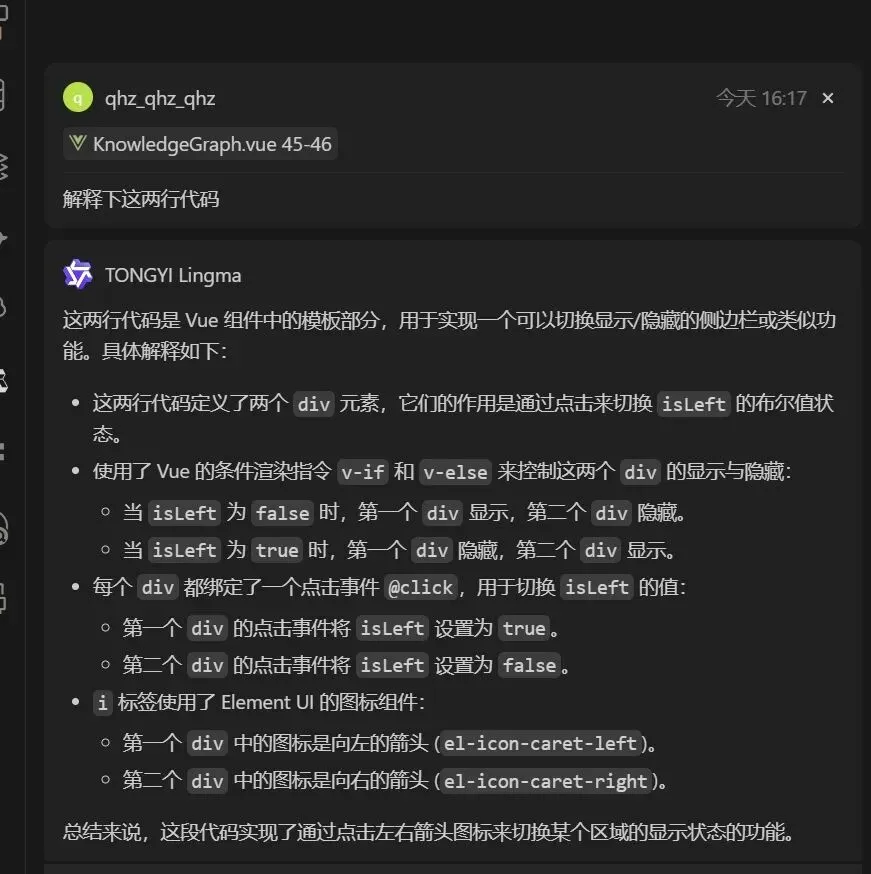 注:这里面有个isLeft,它是一个bool值,单击时改变,从而改变类从【el-icon-caret-left】到【el-icon-caret-right】,看下这两个类,搜索发现没有类的定义,查下AI,如下: