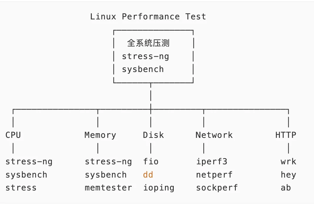 压测 → 发现瓶颈 → 优化 → 再压测本文系统性整理Linux下最重要的性能压测工具体系,覆盖: