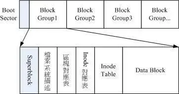 Linux 正统的文件系统(如 Ext2、3等)将硬盘分区时会划分出超级块、inode Table 区块和 data block 数据区域。一个文件由一个超级块、inode 和数据区域块组成。Inode 包含文件的属性(如读写属性、owner 等,以及指向数据块的指针),数据区域块则是文件内容。当查看某个文件时,会先从 inode table 中查出文件属性及数据存放点,再从数据块中读取数据。
