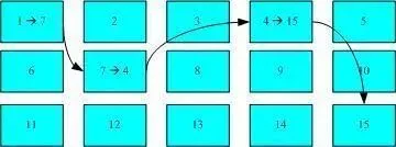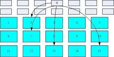 我们将 inode 与 block 区块用图解来说明一下,如下图所示,文件系统先格式化出 inode 与 block 的区块,假设某一个文件的属性与权限数据是放置到 inode 4 号(下图较小方格内),而这个 inode 记录了文件数据的实际放置点为 2,7,13,15 这四个 block 号码,此时我们的操作系统就能够据此来排列磁盘的阅读顺序,可以一口气将四个 block 内容读出来!那么数据的读取就如同下图中的箭头所指定的模样了。