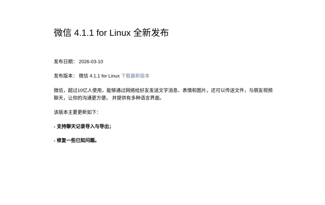 目前微信Linux 4.1.1版本已正式上架,两种更新方式,大家可根据自己的系统选择: