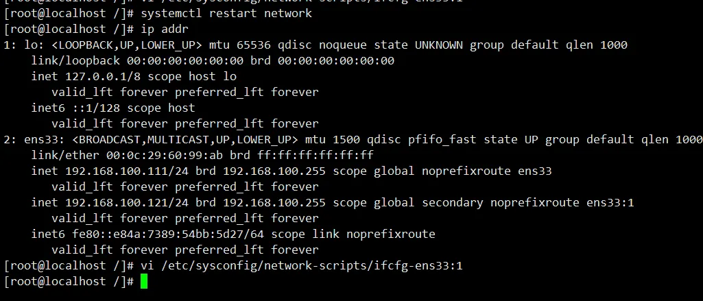 ip addr show[root@localhost /]# vim /etc/sysconfig/network-scripts/ifcfg-ens33TYPE="Ethernet"PROXY_METHOD="none"BROWSER_ONLY="no"BOOTPROTO="none"DEFROUTE="yes"IPV4_FAILURE_FATAL="no"IPV6INIT="yes"IPV6_AUTOCONF="yes"IPV6_DEFROUTE="yes"IPV6_FAILURE_FATAL="no"IPV6_ADDR_GEN_MODE="stable-privacy"NAME="ens33"UUID="61f9f213-aa78-4b4c-a988-2fe7ea2a69a0"DEVICE="ens33"ONBOOT="yes"IPADDR="192.168.100.111"PREFIX="24"GATEWAY="192.168.100.1"DNS1="114.114.114.114"DNS2="8.8.8.8"IPV6_PRIVACY="no"