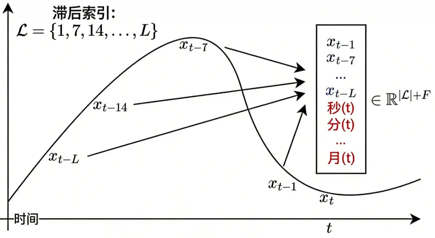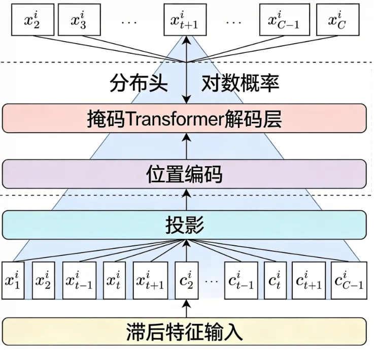 模型的输入是单变量时间序列在特定时间步的标记值。为了增强预测能力,模型还会结合多种协变量,包括一组预定义的滞后值、日期时间特征以及序列的统计摘要。这些输入经过多层掩码解码器投影后,传递给分布头,从而预测下一个时间步的分布参数。