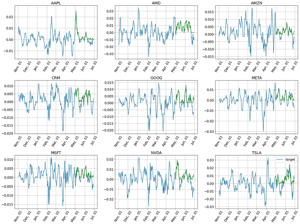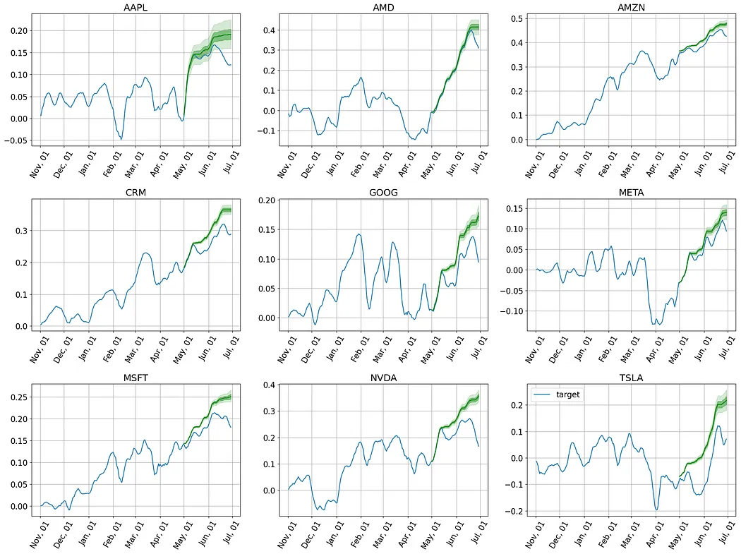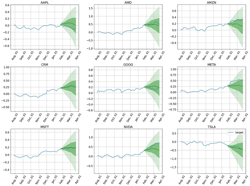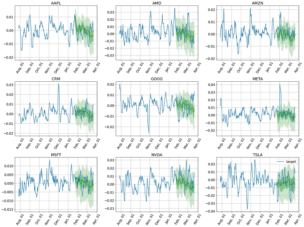 接下来,我们将通过实际案例,检验Lag-Llama在预测科技巨头股票收益率方面的表现。我们将从零样本预测开始,然后通过微调进行优化,并最终通过回测来评估其在真实交易中的价值。