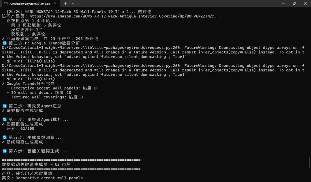 多维数据交叉校验: 脚本自动拆解中文属性后,通过 Google 趋势验证热度,通过 Amazon 验证商用词,并重点通过 Reddit 帖子搜索还原用户心智模型,实现多轮语义重构。