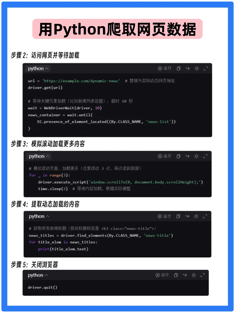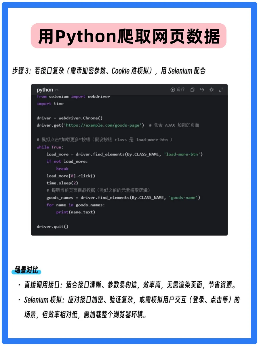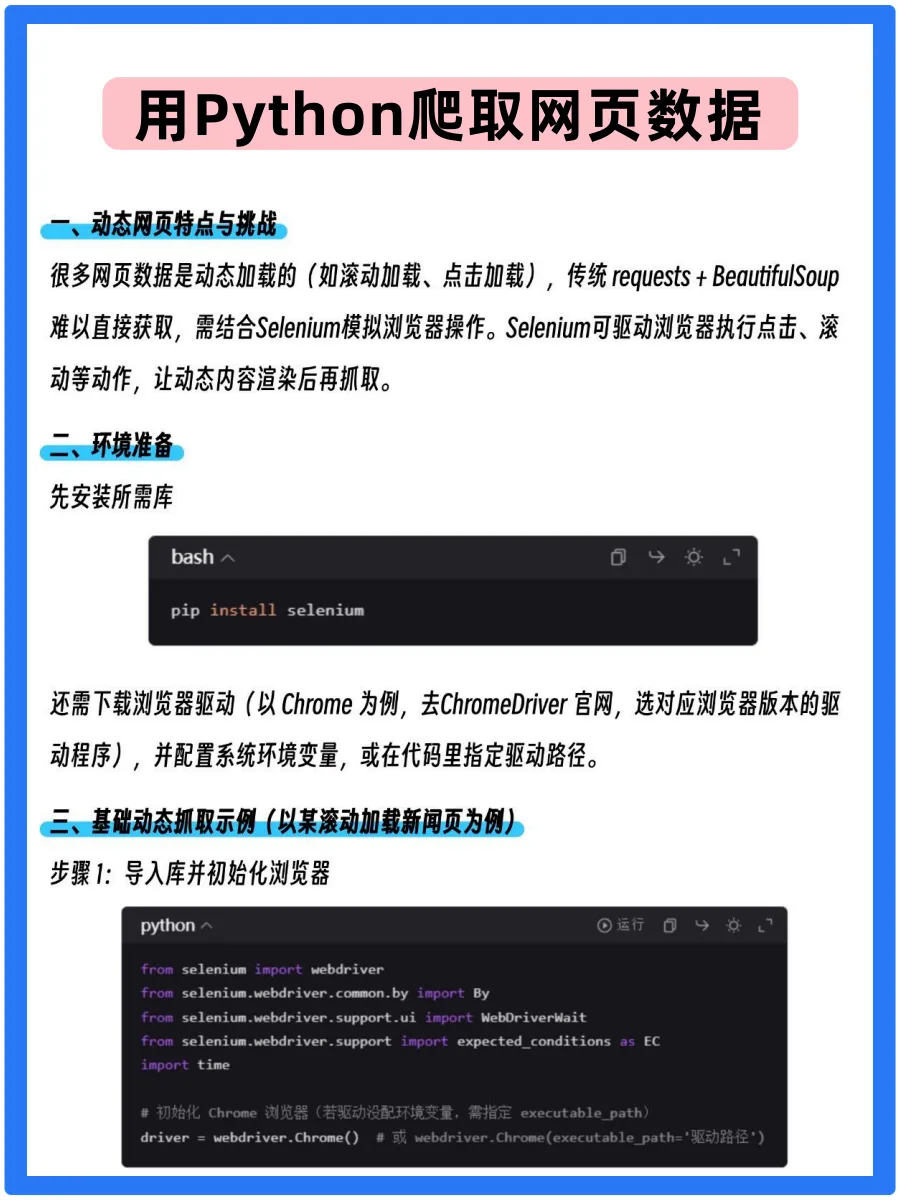 不用复杂操作,简单几步教你突破动态网页限制:先备环境,装 Selenium 库、配浏览器驱动 。面对滚动 / 点击加载的页面,用 Selenium 模拟浏览器操作,自动滚动、等待内容渲染,轻松抓取动态数据。