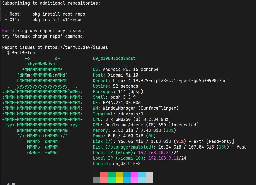 - • Termux中可以通过proot部署完整Linux环境, 但有部分性能损失(约10% - 20%)