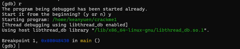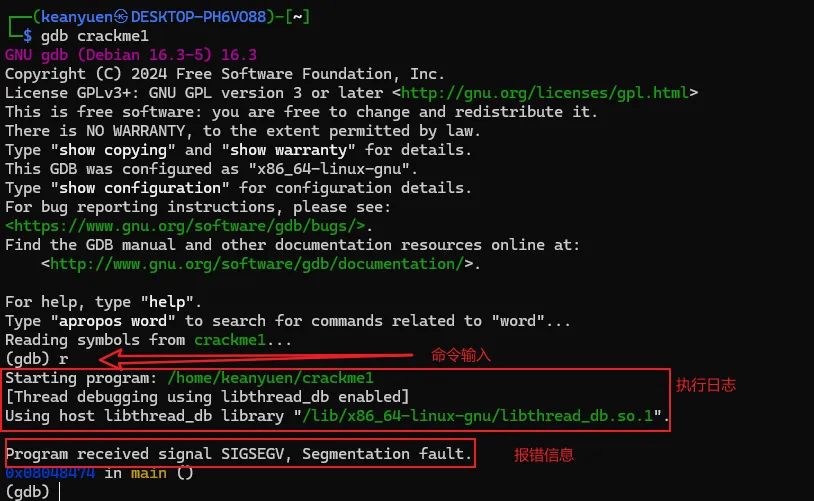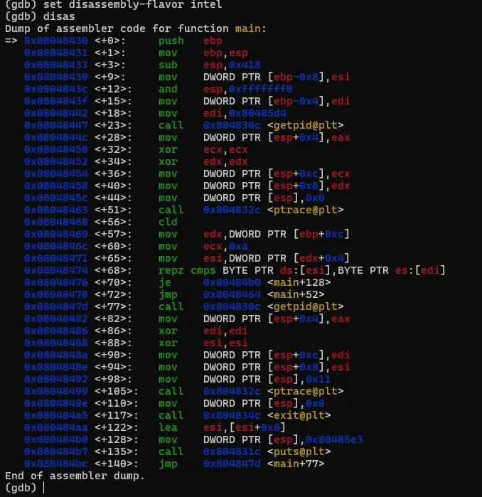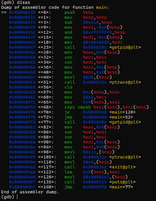 将文件解压后,有一个名为"crackme1"的可执行文件,先尝试运行一下看看大概的执行逻辑。直接退出了,在这过程中没有要求任何的输入信息。接着就使用GDB来一探究竟。直接在命令行输入"gdb <文件名>",打开gdb的同时将破解的执行文件加载到gdb进程中。此时crackme1只是加载到gdb中,并未执行任务逻辑。如果要执行crackme1程序,可以输入"run"命令,或者使用"run"的简化版命令"r"。gdb中的命令基本都有简化版,可以记忆一下。在界面中输入"run"或"r"命令后,gdb就执行crackme1程序,结果如图。当输入"r"命令后,程序开始执行,同时打印出了一些日志信息,大概是说程序加载了系统的什么库之类的内容。可以先忽略。最后程序报了一个异常,然后中止了。而这个异常信息与直接执行程序所报的信息不一致,可能的原因是程序有进程是否调试的判断 。上面是在GDB中直接执行了程序,我们有没有方法将让程序中断在程序入口,然后分析其中的具体逻辑呢?答案肯定是有的,我们可以先在程序入口设置一个断点,然后再执行程序。当程序中断后,我们将程序的汇编代码打印出来分析。完成上面的步骤我们首先需要一个设置断点的命令:"break"、"b"。其中"b"中"break"命令的简写。命令有了,但加在哪个位置呢。这里可以使得小技巧,在上面的执行信息中的最后,有这么一句信息:这个信息主要描述的是当前执行的函数范围。0x08048474 是报错的地址,main就是我们写c程序时熟悉的入口函数名称了。能显示main()的信息,则代表了程序在编译的时候保留了一些符号信息。我们可以使用"b"命令通过main符号来设置断点。设置断点的格式如下,注意前面的*号是必须的。当设置成功后,gdb会反馈断点1设置在在 0x08048430的地址上。此时输入"r"命令,重新执行程序,gdb会要求确认是否重新执行,输入y 回车即可。程序重新执行后,如无意外,会提示程序停止在我们刚设置的断点上:此时,我们可以执行反汇编命令,打印出汇编代码作进入步的分析了。“disassemble”就是我们需要的命令了,同样,该命令也有简称,就是前面的头5个字母:"disas"。输入该命令后gdb就会进行反汇编操作了。如图,gdb会将整个main函数打印出来,最上端的"=>"箭头指向的就是当前的指令位置,也就是我们的main函数。每一行都包括一个16进制的内存地址;"<+xx>"形式的偏移地址,该偏移是从当前函数开始算的,一般可忽略;再接着就是具体的汇编指令了。但这里有个问题,打印出来的汇编格式AT&T的风格,但我熟悉的是intel风格的代码,所以需要转换一下,如果不熟悉AT&T风格代码的同学可以通过以下命令转换一下。set disassembly-flavor intel