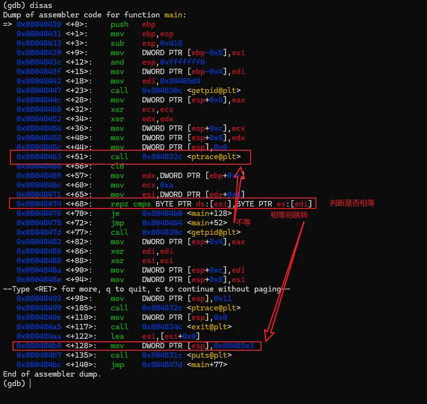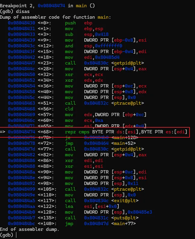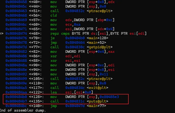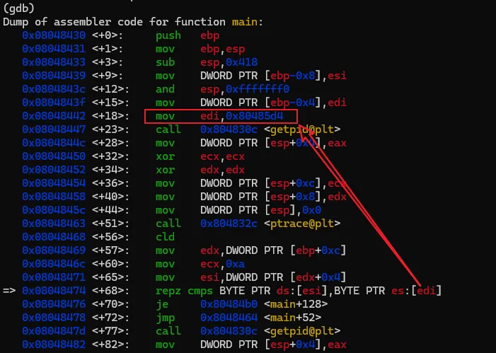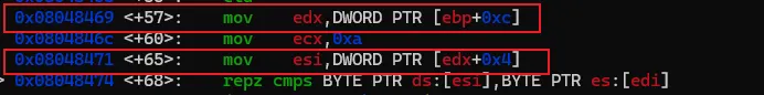 输入上述命令重新反汇编,我们熟悉的风格就又回来了。为了避免每次重新打开gdb要手工设置,可以在用户目录下建一个名为".gdbinit"的文件,然后将上述命令写入该文件后保存,那么gdb每次启动都会将汇编风格应用在intel风格上了。汇编代码有了,现在开始进行具体的分析,本次的汇编命令不多,可以先找关键比较命令及关键跳。可以很快地找到,因为带比较逻辑的命令就那么1个,在0x08048474地址上的 repz cmps 指令,如下图。可能该指令对新手比较陌生,不过没关系,见到陌生的命令可以搜一下看是怎么用的。这个指令大概意思是,比较两个字符串是否相等。如果相等,则跳到0x080484b0 继续指行;如果不等则跳到 0x8048464,但明显是找不到指令是从该地址开始的,只找到0x80484643。我们可以继续执行看一下结果会怎样。我们先通过"b"命令把断点设置在 repz cmps 指令处,再执行看能不能断下来。设置完成后,程序还继续停留在原来的地方没动,通过"continue"或简称"c"命令,让程序继续执行。gdb会打印出Continuing信息,然后输出断点信息,表示命中了。再使用"disas"命令验证一下这个repz cmps命令可能 比较陌生,可以分开这样记,cmps 中的cmp是比较的意思,后面的s 代表的是字符串,所以整个cmps就是比较字符串的意思,而repz的rep是重复的意思 ,z代表的是为0。整个命令的意思是逐个比较两个字符串的字符,如果相等就继续,如果不等就停止。而ecx就比较的次数,也就是字符串的长度。结合上面的命令解读,就是比较esi 和 edi 中保存的字符串中头10个字符,如果相等,则执行 je 0x80484b0 指令,跳到0x80484b0地址处执行,如果不等,则执行jmp 0x8048464,无条件跳到0x8048464处执行。由于相等则执行 je 0x80484b0 指令,我们有必要看一下0x80484b0地址的指令处是处理了什么内容。也就是下图红框的位置。这里需要补充一个额外知识点,在32位系统中,一般都是遵循cdecl 和stdcall的程序调用约定,大概意思就是当调用函数时,会先将最后的参数压入栈中,再从后往前依次将参数入栈,然后再调用函数。而cdecl和stdcall调用约定的唯一区别是,一个是调用者平栈,一个是被调用者平栈。从上面的汇编代码来看,call 后面并没有平栈的操作,那可以认为这里都是使用stdcall约定。但我们关注的是参数的使用方式,参数是从后往前入栈的。 mov DWORD PTR [esp],0x80485e3