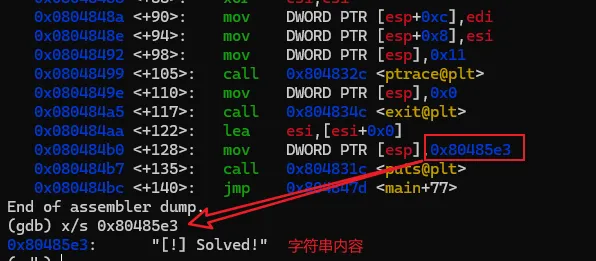 该指令是将立即数 0x80485e3 传进esp寄存器指向的地址中,而esp寄存器是永远指向栈顶的,所以这个指令也相当于"push 0x80485e3" 。然后后面接着一个函数调用,0x80485e3 就是一个指针,是puts函数的参数 call 0x804831c <puts@plt>