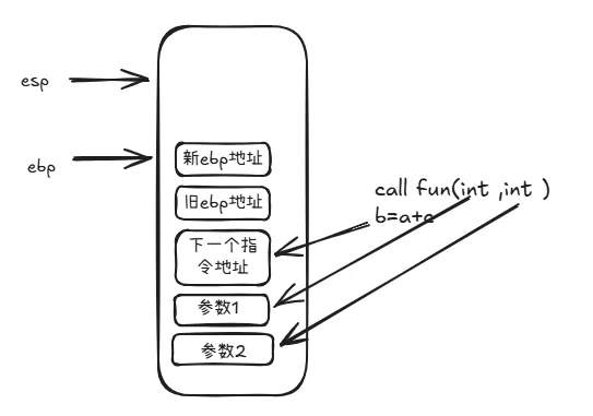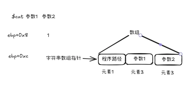 回到汇编上,从定义上可以看到参数是一个字符串指针,用下列命令检查一下内容。命令后面接的"s"代表检查的这个地址是字符串,gdb会一直查询直到字节内容是"0x00"时停止。如上图所示,0x80485e3 地址的内容就是"[!] Solved!"字符串,显示的内容翻译过来就是“解决了”。所以如果"repz cmps"指令处的比较结果是相等,就会跳到这里来,就完成了该题目了。回到"repz cmps"指令处,esi 和edi分别保存着两个地址,分别 指向两个字符串。先看edi指向的是什么内容。从分析得出,在0x08048442地址处,edi只经过了一次赋值就直接用来作比较了。我们继续用"x"命令查看0x80485d4地址的具体内容同时也可以通过edi再次确认一次。通过"$"+edi替换上面命令的具体地址,这是代表取取寄存器的值作为地址使用。可以看到两个内容是一样的。所以edi指向的就是0x80485d4地址指向的字符串 "__gmon_start__"。esi的内容主要由上图两个命令组成,[ebp+0xc]的内容传入到edx,再从[edx+0x4]处传一个双字(4个字节)内容到esi。这是典型的使用对象传值的处理方式,[ebp+0xc]是一个对象指针,然后丙从这个对象指针偏移4个字节取值。在汇编中,数组就是这种取值逻辑。假如有一个数组a,[ebp+0xc]指向的就是数组的开始位置,同时第一个元素的值 ,[ebp+0xc]=a[0]的值,然后偏移4个字节,那么[ebp+0xc+0x4]=a[1]了,如此类推,[ebp+0xc+0x4+0x4]=a[2]。知道这两条命令的逻辑后,最后就剩下ebp+0xc的值是哪里来的。由于我们现在分析的程序的main函数,在这之前是没有用户输入的了,那么我们可以联想到会不会跟程序调用时的参数有关。还真没错。在32位的逆向过程中,有些规律我们可以先记着。就是在一个程序代码中,ebp+0x8 是第一个入参,ebp+0xc是第二个入参。由于篇幅关系,这里只简单带过一下。那为什么不是直接从ebp开始呢,因为每一次的函数调用,都会形成一个栈桢,在系统层面,我们写的main函数,也只是相当是一个函数,只是该函数是被系统调用的。然后每个栈桢会依次由三部分组成,第一个是被调用函数的参数,然后是返回地址,最后是保存当前栈桢的栈底地址。大概示意图如下图我们回忆一下,在我们写c/c++的时间,main函数是这样写的main(int argc, char **argv)
