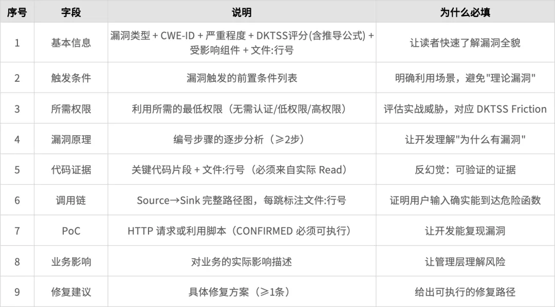 可信度:9 个必填字段 + 字段完整性检查 = 每个漏洞都有完整证据链,开发团队不会质疑"这是不是 AI 编的"