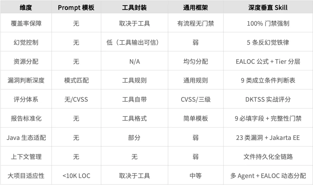LLM并非没有代码审计能力,而是缺少资深审计员的"工作方法和质量标准"。Skill的核心不是教LLM"什么是漏洞",而是把十几年实战沉淀的审计流程、资源分配、质量护栏编码成可执行的协议——让LLM的"知识储备"有"骨架"可依,从"天赋异禀但无章法"变成"专业且可控"。