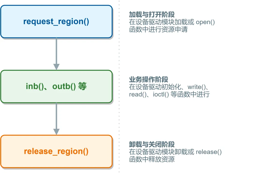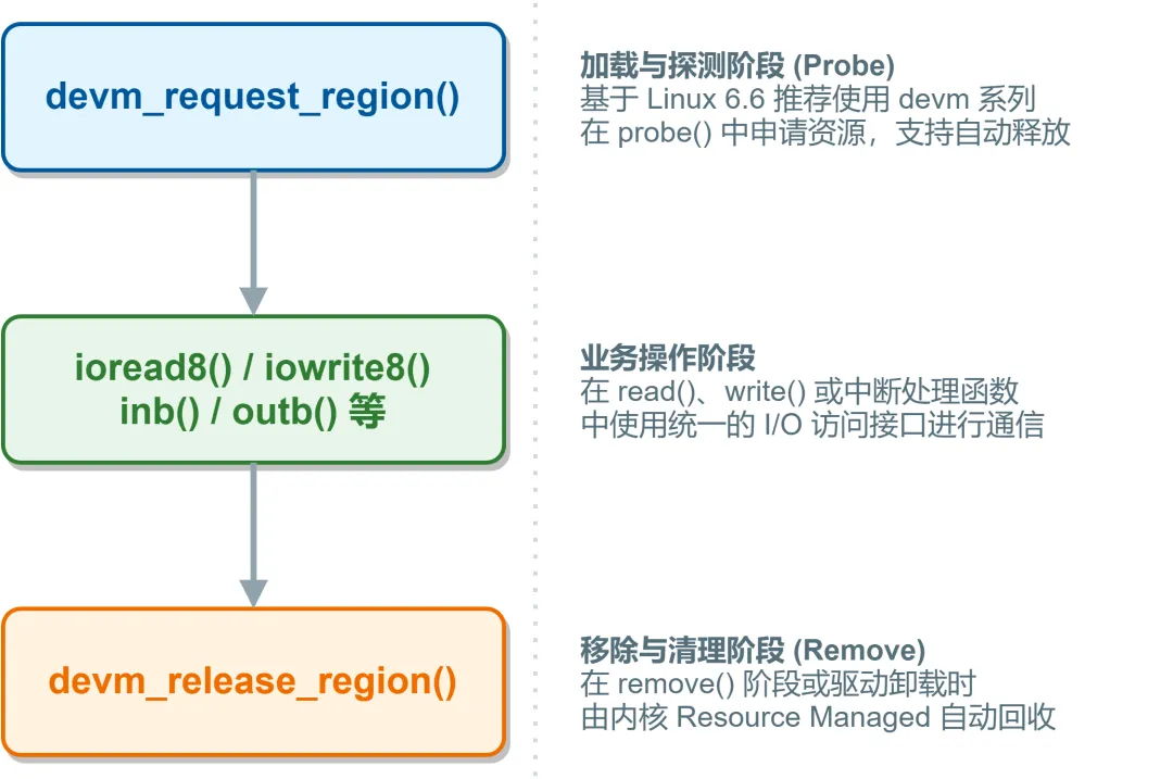 Linux内核中,IO端口是系统共享资源,驱动程序在访问前必须向内核申请,使用完成后释放,否则会导致资源冲突。Linux 6.6推荐使用devm_*系列托管接口,基于RAII思想将资源生命周期与设备对象绑定,无需手动释放,大幅降低资源泄漏风险。