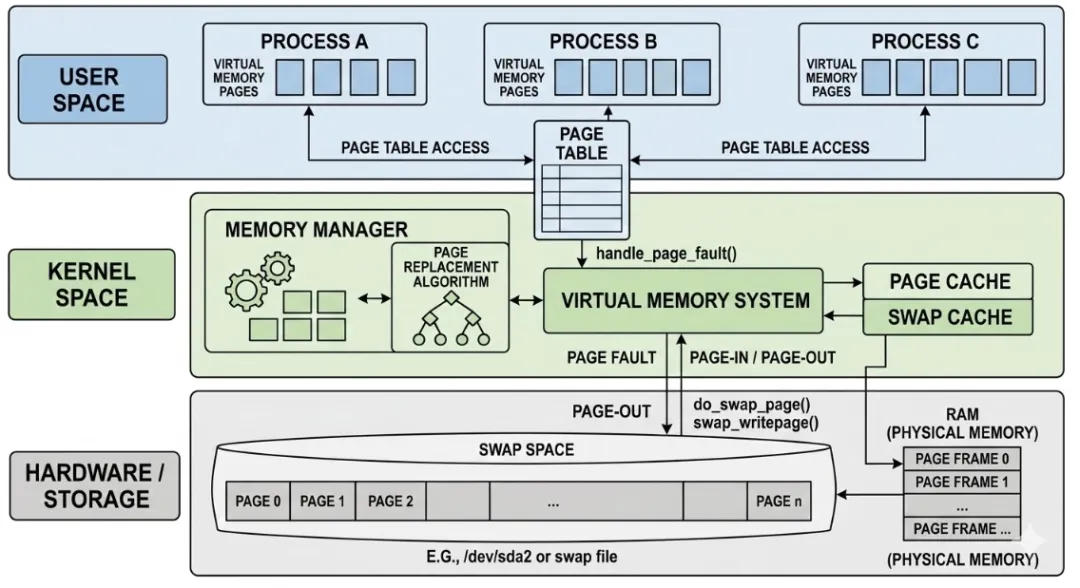 CPU的速度是纳秒级,内存是微秒级,而磁盘是毫秒级——这几个数量级的差距,决定了现代操作系统必须有一套复杂的存储层次体系。当物理内存(RAM)不够用时,我们不能让系统直接崩溃,必须有个后备方案。