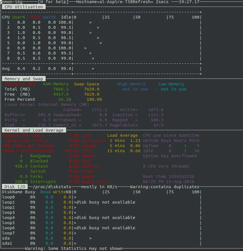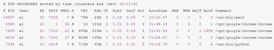 # 显示所有的进程统计信息,包括idle进程。pidstat -p ALL# 更加详细的显示了线程统计信息。pidstat -p ALL -t# 周期采样和采样次数pidstat [option] interval [count]15时18分21秒 UID PID minflt/s majflt/s VSZ RSS %MEM Command15时18分21秒 010.020.0018531630280.08 systemd15时18分21秒 020.000.00000.00 kthreadd15时18分21秒 040.000.00000.00 kworker/0:0H15时18分21秒 060.000.00000.00 mm_percpu_wq15时18分21秒 070.000.00000.00 ksoftirqd/015时18分21秒 080.000.00000.00 rcu_sched15时20分40秒 UID PID kB_rd/s kB_wr/s kB_ccwr/s iodelay Command15时20分40秒 01 -1.00 -1.00 -1.00243523129 systemd15时20分40秒 02 -1.00 -1.00 -1.000 kthreadd15时20分40秒 04 -1.00 -1.00 -1.000 kworker/0:0H15时20分40秒 06 -1.00 -1.00 -1.000 mm_percpu_wq15时20分40秒 07 -1.00 -1.00 -1.00714512328679 ksoftirqd/015时20分40秒 08 -1.00 -1.00 -1.00417757303594 rcu_sched240194063832606752 nomachine_6.0.80_1.exe# 整个操作总耗时,0.263-0.094-0.011=0.158是IO等待耗时。real 0m0.263s# 用户态耗时user 0m0.094s# 内核态耗时sys 0m0.011s240194063832606752 nomachine_6.0.80_1.exe# 第二次执行就可以看出等待IO操作的时间基本上没有了。real 0m0.098suser 0m0.097ssys 0m0.000s# 显示Load Avg信息和平均频率等LoadAvg0.660.540.49, FreqAvg. 1.46GHz, 4CPUs online# 进程切换次数、硬中断、软中断等等统计信息。# CPU占用率、用户空间和内核空间占用率等。3791.1Ctxt/s, 1709.9 IRQ/s, 1800.0 softIRQ/s, 0.0new tasks/s, 1 running, 0 blocked %CPU %USR %SYS PID S CPU TimeTask25.7425.740.0011435 R 32.29w /usr/bin/python315.8415.840.009445 S 01.49w /usr/lib/xorg/Xorg10.899.900.992722 S 11.05w compiz7.920.007.9232352 S 216.60s [kworker/2:1]0.990.000.9932397 R 10.01s cpustat0.990.990.0011046 S 216.20h compiz0.990.990.001317 S 08.76h /usr/NX/bin/nxnode.bin0.990.000.9910293 S 11.24m [kworker/1:2]64.3653.4710.89TotalLoadAvg0.660.540.49, FreqAvg. 1.75GHz, 4CPUs online2834.8Ctxt/s, 1190.9 IRQ/s, 1183.3 softIRQ/s, 0.0new tasks/s, 4 running, 0 blocked %CPU %USR %SYS PID S CPU TimeTask25.7625.760.0011435 R 32.29w /usr/bin/python318.1818.180.009445 S 01.49w /usr/lib/xorg/Xorg7.587.580.002722 S 11.05w compiz6.060.006.0632352 S 216.64s [kworker/2:1]1.520.001.5232397 R 10.02s cpustat1.520.001.528 S 03.00h [rcu_sched]1.520.001.5218409 S 01.16m update-notifier62.1251.5210.61TotalDistribution of CPU utilisation (per Task):% CPU UtilisationCount (%)0.00 - 1.9770698.881.97 - 3.9400.003.94 - 5.9100.005.91 - 7.8820.287.88 - 9.8500.009.85 - 11.8200.0011.82 - 13.7910.1413.79 - 15.7600.0015.76 - 17.7310.1417.73 - 19.7010.1419.70 - 21.6700.0021.67 - 23.6400.0023.64 - 25.6120.2825.61 - 27.5700.0027.58 - 29.5400.0029.55 - 31.5100.0031.52 - 33.4800.0033.48 - 35.4500.0035.45 - 37.4200.0037.42 - 39.3910.14Distribution of CPU utilisation (per CPU):----------------------------------------------各CPU占用率,分用户空间和内核空间。 CPU# USR% SYS%017.371.2018.982.4020.607.19325.750.00