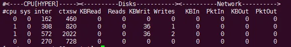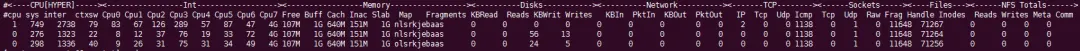 b – buddy info (内存碎片)c – 所有CPU的合一统计信息;C - 单个CPU的统计信息。d – 整个文件系统Disk合一统计信息;C - 单个磁盘的统计信息。f – NFS V3 Datai – InodeandFileSystemj – 显示每个CPU的Interrupts触发情况;J - 显示每个中断详细触发情况。l – Lustrem – 显示整个系统Memory使用情况;M - 按node显示内存使用情况。n – 显示整个系统的Networks使用情况;N - 分网卡显示网络使用情况。s – Socketst – TCPx – Interconnecty – 对系统所有Slabs (系统对象缓存)使用统计信息;Y - 每个slab使用的详细信息。