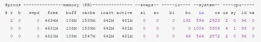 11:15:41 up 82 days, 20:34, 8 users, load average: 0.28, 0.40, 0.43procs -----------memory---------- ---swap-- -----io---- -system-- ------cpu----- r b swpd free buff cache si so bi bo in cs us sy id wa st104725762286885590921061756009391084870010472576228184559100106175600013153233951068400104725762293085591001061616000014463449105850000472576229592559108106161600061419347410585001047257622980455910810616160000144634391058500