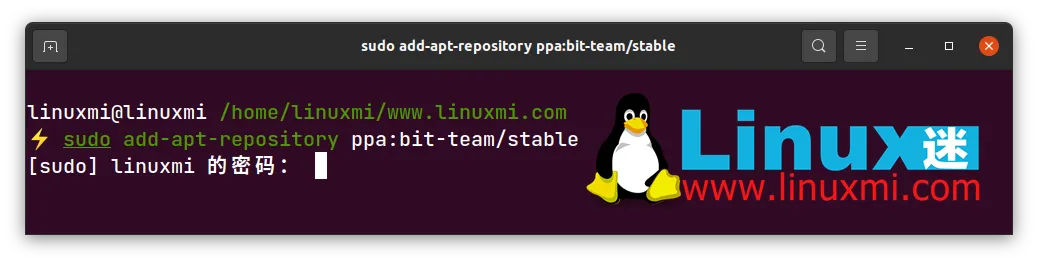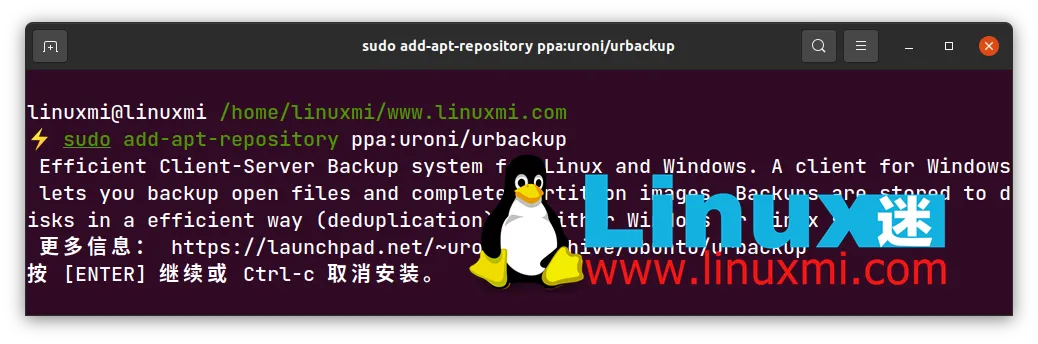 然后,将官方的UrBackup存储库添加到您的系统中。linuxmi@linuxmi /home/linuxmi/www.linuxmi.com ⚡ sudo add-apt-repository ppa:uroni/urbackup