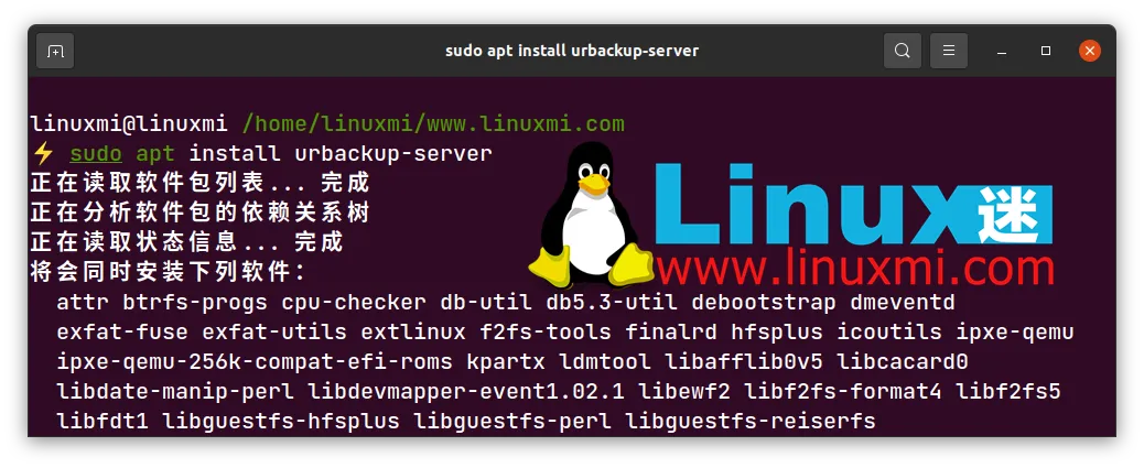 最后,按如下方式安装 urbackup-server 软件包:linuxmi@linuxmi /home/linuxmi/www.linuxmi.com ⚡ sudo apt install urbackup-server