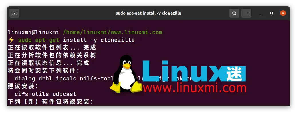 linuxmi@linuxmi /home/linuxmi/www.linuxmi.com ⚡ sudo apt-get install -y clonezilla