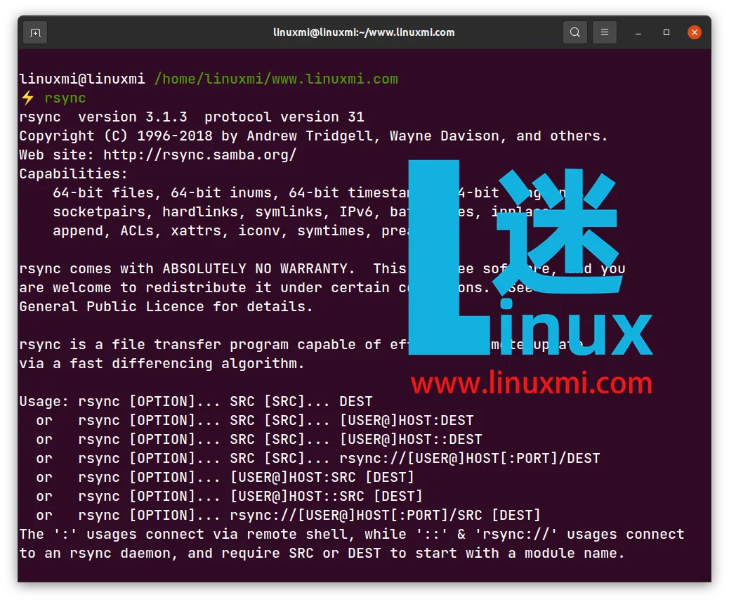 Rsync 是一个由 CLI 驱动、基于 Linux 的备份工具,它仍然是企业级任务的最大竞争者之一。它提供了最高级的功能,如增量备份,具有更新整个目录树的选项,文件系统支持本地和远程备份,以及文件权限保留。您还可以使用图形用户界面 Grsync;但是,在命令行版本中使用脚本进行备份自动化更容易。您可以使用 rsync 备份工具同步两台服务器。键入以下命令以在基于 Debian 的系统上安装 rsync:linuxmi@linuxmi /home/linuxmi/www.linuxmi.com ⚡ sudo apt-get install rsync