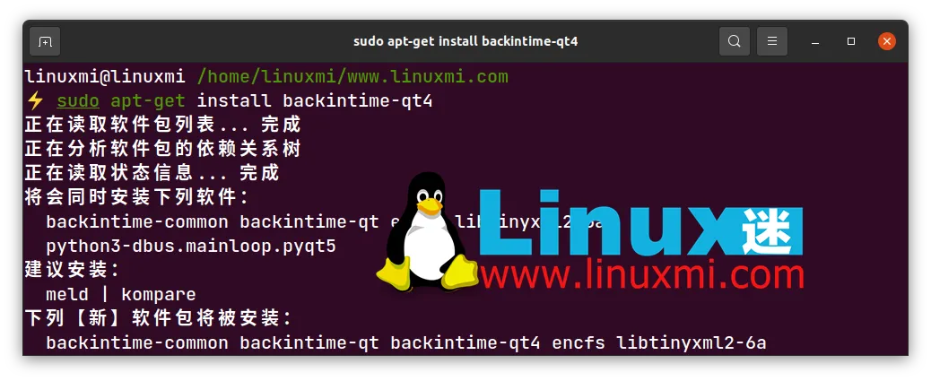 linuxmi@linuxmi /home/linuxmi/www.linuxmi.com⚡ sudo apt-get updatelinuxmi@linuxmi /home/linuxmi/www.linuxmi.com⚡ sudo apt-get install backintime-qt4