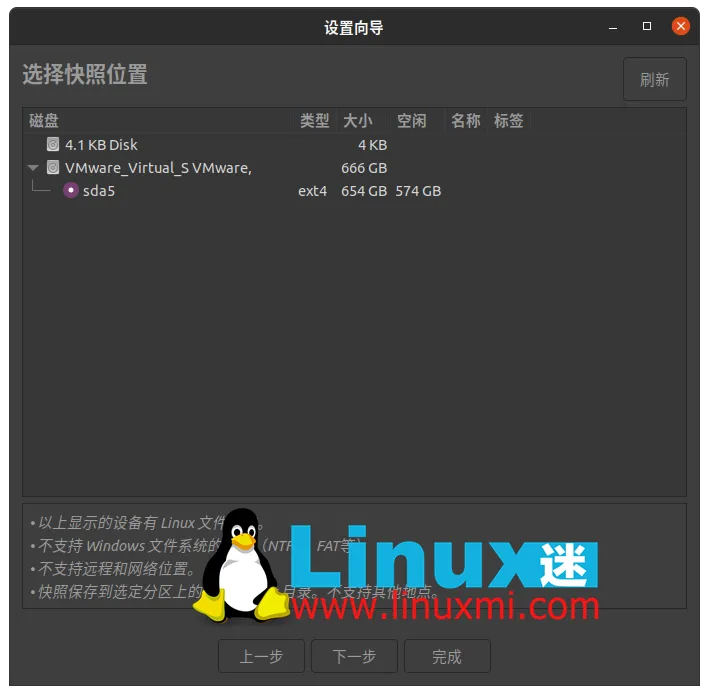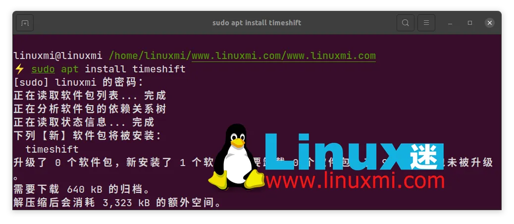 时移主要用于备份整个操作系统,包括系统上的每个文件。与Back In Time一样,Timeshift也会拍摄目录的快照,然后在后端使用rsync或Btrfs备份它们。Timeshift非常适合想要备份整个系统的普通用户。Timeshift 的功能与 Windows 上的 Windows System Restore 和 Mac 上的 Time Machine 工具非常相似。您可以使用系统备份将计算机还原到进行备份时的相同状态。发出以下命令以在基于 Debian 的发行版(如 Ubuntu)上安装 Timeshift:linuxmi@linuxmi /home/linuxmi/www.linuxmi.com/www.linuxmi.com ⚡ sudo apt install timeshift