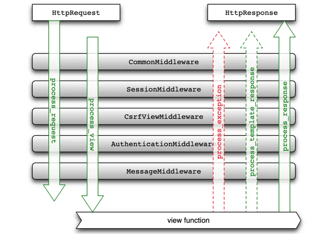 from django.utils.deprecation import MiddlewareMixinclassMyMiddleware(MiddlewareMixin):defprocess_request(self, request):passdefprocess_view(self, request, view_func, view_args, view_kwargs):passdefprocess_template_response(self, request, response):passdefprocess_response(self, request, response):passdefprocess_exception(self, request, exception):pass