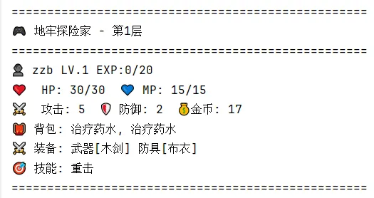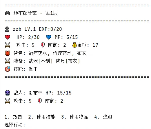 import randomimport osimport jsonfrom datetime import datetimeclass DungeonAdventure: def __init__(self): self.player = { "name": "冒险者", "level": 1, "hp": 30, "max_hp": 30, "mp": 15, "max_mp": 15, "attack": 5, "defense": 2, "exp": 0, "gold": 0, "floor": 1, "inventory": ["治疗药水", "治疗药水"], "equipment": {"武器": "木剑", "防具": "布衣"}, "skills": ["重击"] } self.enemies = { "slime": {"name": "史莱姆", "hp": 10, "attack": 3, "defense": 1, "exp": 5, "gold": 2}, "goblin": {"name": "哥布林", "hp": 15, "attack": 5, "defense": 2, "exp": 8, "gold": 5}, "skeleton": {"name": "骷髅", "hp": 20, "attack": 7, "defense": 3, "exp": 12, "gold": 8}, "orc": {"name": "兽人", "hp": 30, "attack": 10, "defense": 5, "exp": 20, "gold": 15}, "boss": {"name": "地牢守护者", "hp": 100, "attack": 15, "defense": 8, "exp": 50, "gold": 50} } self.items = { "治疗药水": {"type": "消耗品", "effect": "恢复20HP", "value": 10}, "魔法药水": {"type": "消耗品", "effect": "恢复10MP", "value": 15}, "木剑": {"type": "武器", "attack": 3, "value": 20}, "铁剑": {"type": "武器", "attack": 6, "value": 50}, "钢剑": {"type": "武器", "attack": 10, "value": 100}, "布衣": {"type": "防具", "defense": 2, "value": 15}, "皮甲": {"type": "防具", "defense": 4, "value": 40}, "锁子甲": {"type": "防具", "defense": 7, "value": 80}, "神秘宝箱": {"type": "特殊", "effect": "随机物品", "value": 0} } self.skills = { "重击": {"mp_cost": 5, "damage_mult": 1.5, "description": "消耗5MP,造成150%伤害"}, "治疗术": {"mp_cost": 8, "heal": 20, "description": "消耗8MP,恢复20HP"}, "火球术": {"mp_cost": 10, "damage_mult": 2.0, "description": "消耗10MP,造成200%魔法伤害"} } self.game_running = True self.current_enemy = None def show_status(self): """显示玩家状态""" os.system('cls' if os.name == 'nt' else 'clear') print(f"\n{'='*50}") print(f"🎮 地牢探险家 - 第{self.player['floor']}层") print(f"{'='*50}") print(f"👤 {self.player['name']} LV.{self.player['level']} EXP:{self.player['exp']}/{self.player['level']*20}") print(f"❤️ HP: {self.player['hp']}/{self.player['max_hp']} 💙 MP: {self.player['mp']}/{self.player['max_mp']}") print(f"⚔️ 攻击: {self.player['attack']} 🛡️ 防御: {self.player['defense']} 💰金币: {self.player['gold']}") print(f"🎒 背包: {', '.join(self.player['inventory']) if self.player['inventory'] else'空'}") print(f"⚔️ 装备: 武器[{self.player['equipment']['武器']}] 防具[{self.player['equipment']['防具']}]") print(f"🎯 技能: {', '.join(self.player['skills'])}") print(f"{'='*50}") def explore(self): """探索地牢""" events = [ self.encounter_enemy, self.find_treasure, self.find_safe_room, self.find_trap, self.find_merchant ] print("\n🚪 你开始探索地牢...") input("按回车继续...") event = random.choice(events) event() def encounter_enemy(self): """遭遇敌人""" if self.player['floor'] >= 10: enemy_type = "boss" if random.random() < 0.3 else random.choice(["orc", "skeleton"]) elif self.player['floor'] >= 7: enemy_type = random.choice(["orc", "skeleton", "goblin"]) elif self.player['floor'] >= 4: enemy_type = random.choice(["goblin", "skeleton"]) else: enemy_type = random.choice(["slime", "goblin"]) self.current_enemy = self.enemies[enemy_type].copy() self.current_enemy["current_hp"] = self.current_enemy["hp"] print(f"\n⚠️ 遭遇了{self.current_enemy['name']}!") self.battle() def battle(self): """战斗系统""" while self.current_enemy["current_hp"] > 0 and self.player["hp"] > 0: self.show_status() print(f"\n👾 敌人: {self.current_enemy['name']} HP: {self.current_enemy['current_hp']}/{self.current_enemy['hp']}") print(f"⚔️ 攻击: {self.current_enemy['attack']} 🛡️ 防御: {self.current_enemy['defense']}") print("\n1. 攻击 2. 使用技能 3. 使用物品 4. 逃跑") choice = input("选择行动: ").strip() if choice == "1": self.attack_enemy() if self.current_enemy["current_hp"] > 0: self.enemy_attack() elif choice == "2": self.use_skill() if self.current_enemy["current_hp"] > 0: self.enemy_attack() elif choice == "3": self.use_item() self.enemy_attack() elif choice == "4": if random.random() < 0.5: print("🏃 成功逃脱!") self.current_enemy = None return else: print("❌ 逃跑失败!") self.enemy_attack() else: print("❌ 无效选择") continue input("\n按回车继续...") if self.player["hp"] <= 0: print("💀 你被击败了!游戏结束。") self.game_running = False elif self.current_enemy["current_hp"] <= 0: self.defeat_enemy() def attack_enemy(self): """攻击敌人""" damage = max(1, self.player["attack"] - self.current_enemy["defense"]) self.current_enemy["current_hp"] -= damage print(f"⚔️ 你对{self.current_enemy['name']}造成了{damage}点伤害!") def enemy_attack(self): """敌人攻击""" damage = max(1, self.current_enemy["attack"] - self.player["defense"]) self.player["hp"] -= damage print(f"💥 {self.current_enemy['name']}对你造成了{damage}点伤害!") def use_skill(self): """使用技能""" print("\n可用技能:") for i, skill in enumerate(self.player["skills"], 1): print(f"{i}. {skill} - {self.skills[skill]['description']}") try: choice = int(input("选择技能: ")) - 1 if 0 <= choice < len(self.player["skills"]): skill = self.player["skills"][choice] skill_info = self.skills[skill] if self.player["mp"] < skill_info["mp_cost"]: print("❌ MP不足!") return self.player["mp"] -= skill_info["mp_cost"] if skill == "重击": damage = max(1, int(self.player["attack"] * skill_info["damage_mult"]) - self.current_enemy["defense"]) self.current_enemy["current_hp"] -= damage print(f"💥 使用{skill}!造成{damage}点伤害!") elif skill == "治疗术": heal = min(skill_info["heal"], self.player["max_hp"] - self.player["hp"]) self.player["hp"] += heal print(f"💚 使用{skill}!恢复{heal}点HP!") elif skill == "火球术": damage = max(1, int(self.player["attack"] * skill_info["damage_mult"])) self.current_enemy[