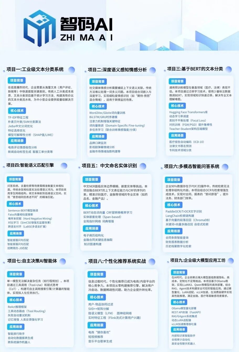 课程体系包含了Ai领域前沿技术、核心项目,覆盖非常全面,适用于所有行业的算法岗位,整个课程更注重带领学生项目实操和落地,授人以鱼不如授人以渔,学完后还会具备举一反三的能力,无论进入什么行业,算法岗位和项目均能胜任。