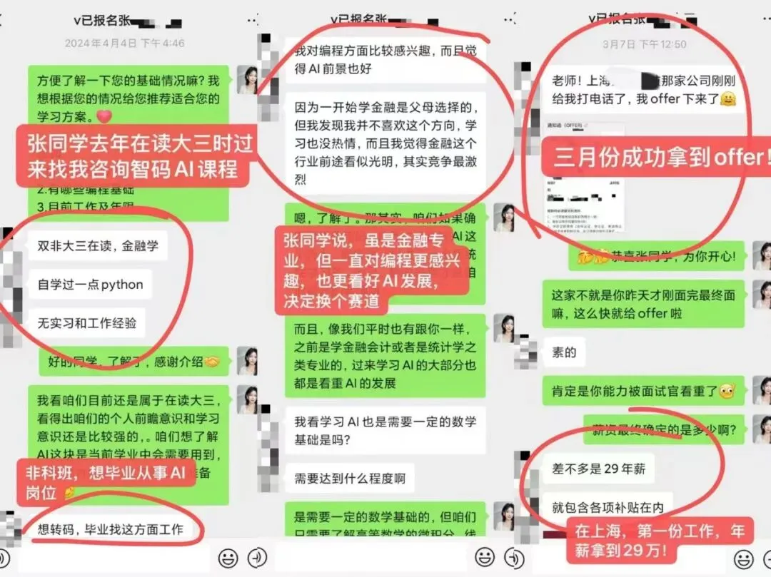 我从业python好多年了,现在作为团队负责人,已经严重意识到了当前普通python岗位饱和严重,上周跟一位某大厂P8技术大佬聊天,他说:近几年python市场越来越卷,人才市场也趋于饱和,不少人职业发展停滞,所以AI的这波风口是难得破局的好机会。为了帮助大家踩上这次风口,拿到高薪offer。我们联合多位互联网头部大厂在职的技术专家、CTO,将自己面试官的视角和企业真实用人需求,全部融进了一套【AI算法保薪就业课程】里。通过“前沿技术、企业级项目、真实工作内推、就业保薪协议”三环保障,为你精准锁定高薪Offer。这门课程承诺:若结业后未能成功就业、或offer薪资低于28W则全额退款(在职人员薪资涨幅40%以上)。以最终offer薪资为导向,拒绝“画饼式”无效交付。据大佬的统计,目前有93%以上的学员通过内推成功就业,上一期学员薪资最高拿到了78k!