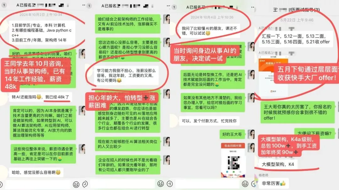 王大哥咨询课程时工作14年,已是开发架构师,薪资也已经拿到48K,但由于在一个赛道久了,也早已遇到瓶颈,王大哥也不甘于此,了解到AI上限高、薪资高、机会更多,经过身边专业的朋友认可后果断加入学习,后面经过某手多轮面试最终拿下大模型架构,K4a级别,年包百万!04 |学历一般也有机会拿高薪offer? @ 刘同学