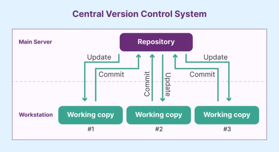 Subversion使用的是集中式的工作模型。在这个模型中,所有的版本控制活动都围绕着一个集中的仓库进行。仓库包含了项目的主历史版本,而开发者在本地的工作副本中进行更改和提交。