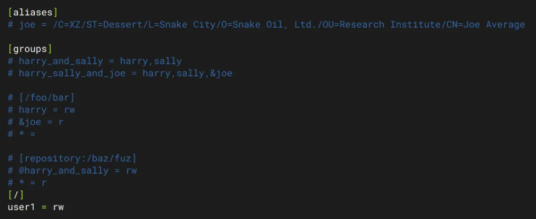 [root@svnserve ~]# vim /etc/httpd/conf.d/subversion.conf<Location /svn>DAV svnSVNPath /var/svn/svnreposAuthType BasicAuthName "Authorization SVN"AuthzSVNAccessFile /var/svn/svnrepos/conf/authzAuthUserFile /var/svn/svnrepos/conf/passwdRequire valid-user</Location>