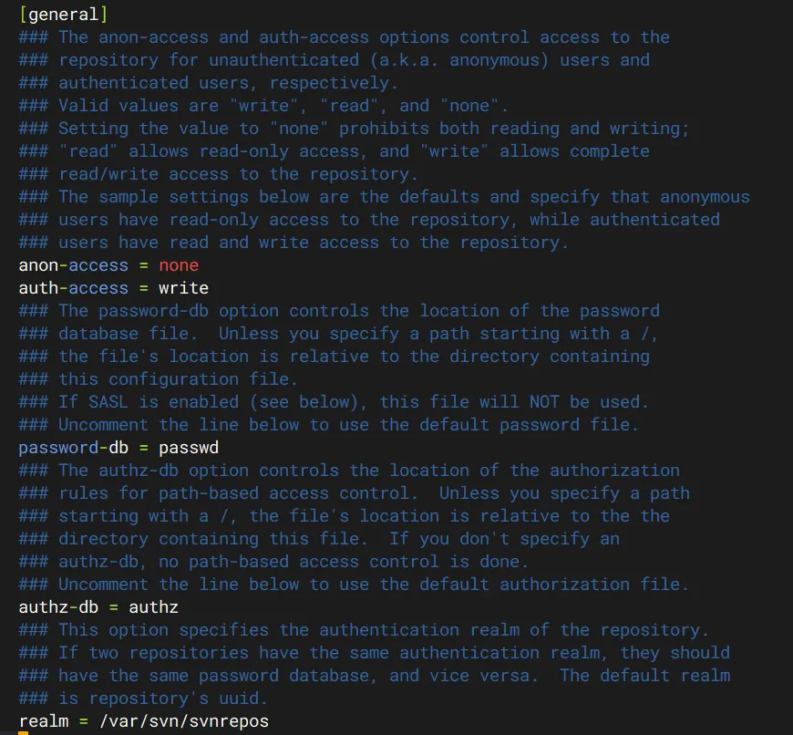 [root@svnserve svnrepos]# lltotal 8drwxr-xr-x. 2 apache apache 54 Mar 12 14:47 confdrwxr-sr-x. 6 apache apache 233 Mar 12 14:47 db-r--r--r--. 1 apache apache 2 Mar 12 14:47 formatdrwxr-xr-x. 2 apache apache 231 Mar 12 14:47 hooksdrwxr-xr-x. 2 apache apache 41 Mar 12 14:47 locks-rw-r--r--. 1 apache apache 229 Mar 12 14:47 README.txt[root@svnserve svnrepos]# cd conf