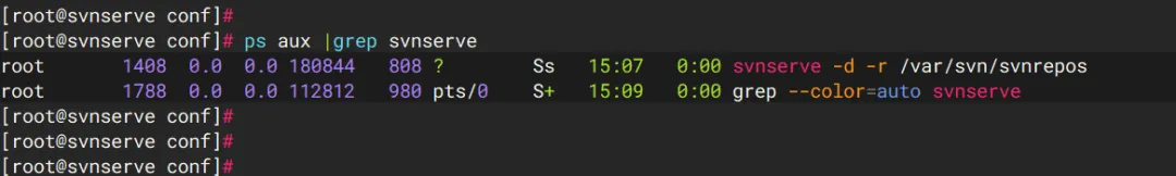 [root@svnserve conf]# svnserve -d -r /var/svn/svnrepos/svnserve: E000098: Can't bind server socket: Address already in use[root@svnserve conf]# ps aux |grep svnserve