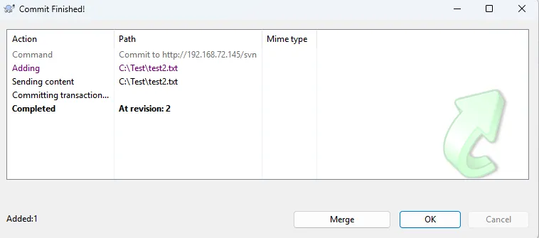 4、 提交Commit:修改后,用户可以将更改提交回仓库。SVN会检查是否有冲突,并且在没有冲突的情况下将更改保存为新的版本号。
