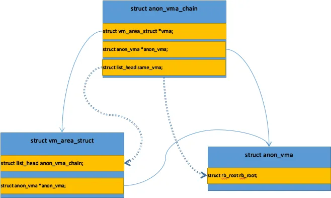AVC数据结构anon_vma_chain->vma指向VMA,anon_vma_chain->anon_vma指向AV。
