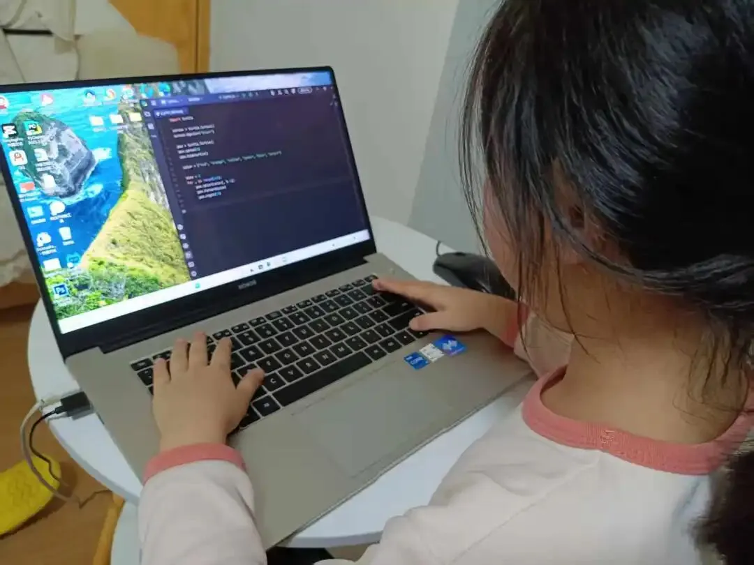 今天小孩8岁了,这个月初开始邪修学习python编程。一开学的时候,我就是让她抄写,就是把一些案例给到她,让她照抄。其实,学习是一件很痛苦的事情,特别是编程,很繁琐,那怎么样才不痛苦?兴趣是最好的老师。给她抄写,能让她慢慢的有成就感,有码感,培养兴趣。然后,就开始让她把代码后面的注释给理解,不懂的文字就查一查,了解每一行代码的作用。这个让她感受到稍微有点痛苦了,毕竟,才这么小,文字就像是天书。但是,运行得出的结果,成就感和喜悦感却让她咬紧牙关,继续向前,坚持。在这,我想说,孩子啊,你有这份韧性,以后生活的风风雨雨才不会把你击倒!今天,给她照抄,理解之后,给她一个框架,在没有现成的代码下,她写下了自己的第一个代码。坐吃山空,还不如让孩子有独立成长,有“找吃的能力”,你觉得呢?