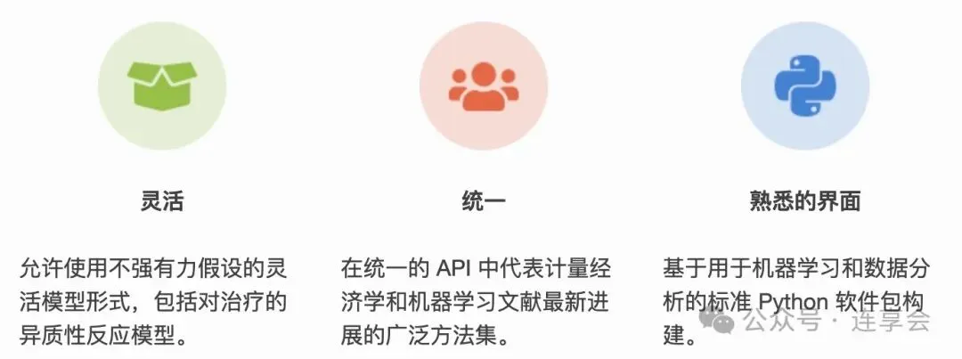 该库将所有这些不同的技术汇集到一个通用的 Python API 中,极大简化了用户的建模流程,是因果推断应用实践的重要利器。