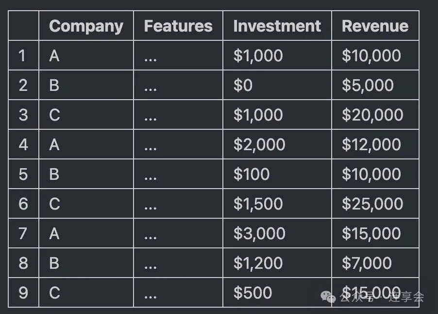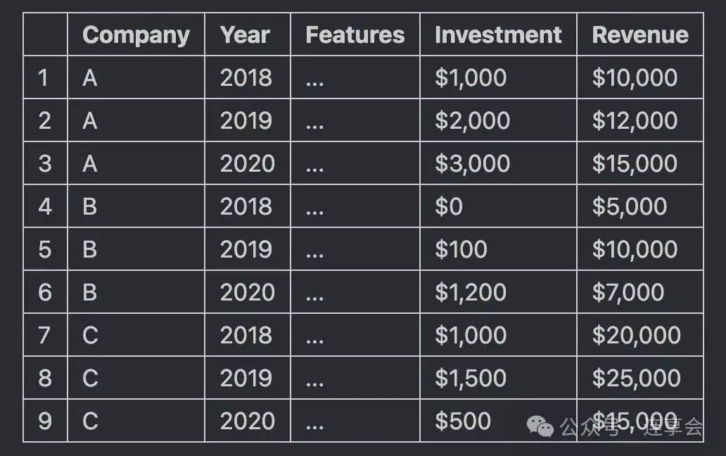 (注:将数据传递给 DynamicDML 估计器时,上面的 “公司” 列与拟合时的 “组” 参数相对应。上面的 “年份” 列不应传入,因为它会从 “公司” 列推断出来)